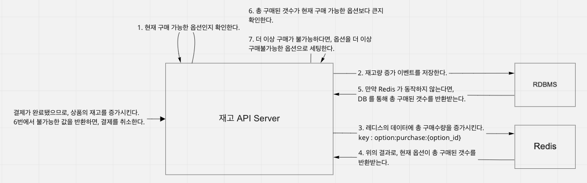 - (From RDB) 레디스가 동작하지 않아, 4번을 통해 구매수량을 반환받지 못하면, RDB 를 통해 옵션의 총 구매수량을 반환받는다.