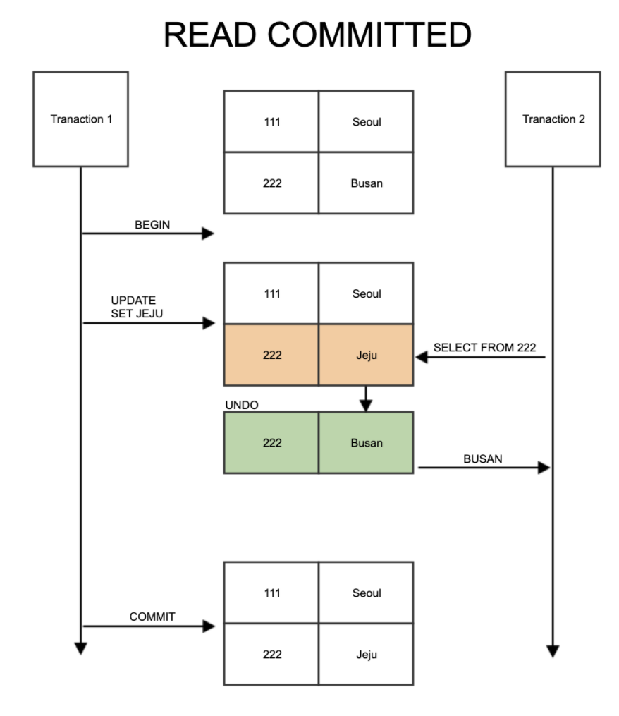 | 아직 1번 트랜잭션이 끝나지 않았지만, READ UNCOMMITTED 는 데이터를 바로 반영하는 격리수준이므로, [222 | BUSAN] 데이터를 얻게됐습니다. | |