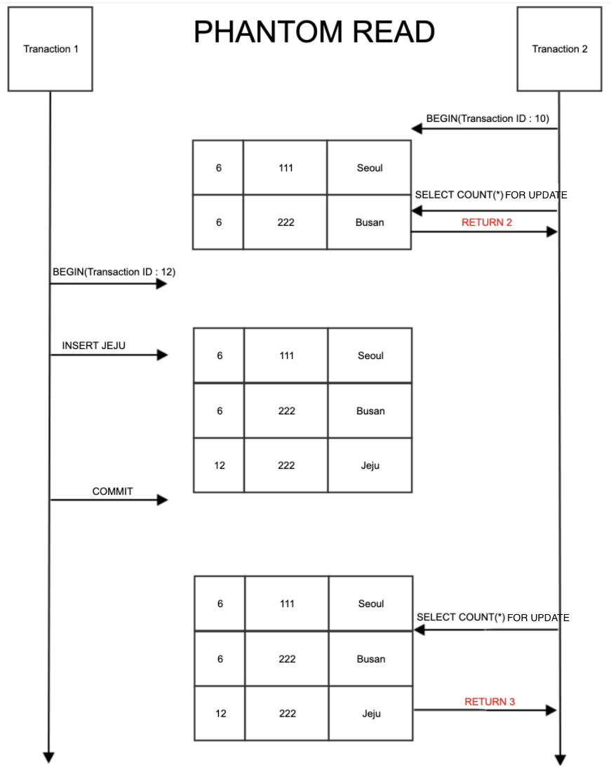 - 가정 상황 : Transaction ID가 6번인 Transaction이 [ 111 | Seoul ] , [ 222 | Busan ] 을 만들어놨다.