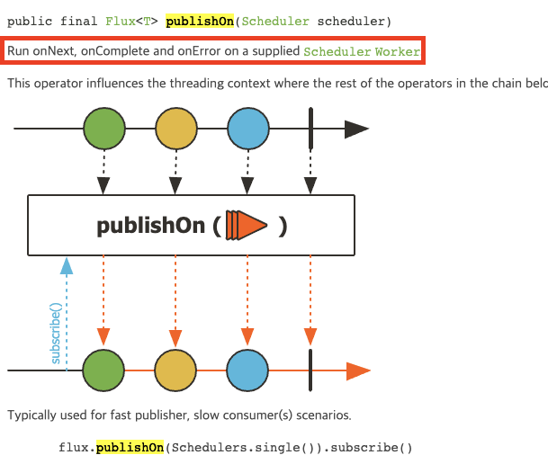 - onNext, onComplete, onError는 publishOn에 정의한 쓰레드(스케줄러) 를 통해 동작하도록 하는 오퍼레이터이다.